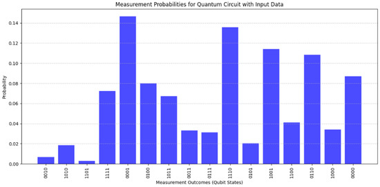 This equation signifies the application of a function f to determine which class a given measured state z belongs to. By utilizing the function f, the output is returned as either −1 or +1, allowing us to ascertain the class membership based on the returned value. Figure 6 shows an example of measuring the probability using four qubits (i.e., variables). It visualizes the results obtained from measuring the first row of data from the actual test dataset using a quantum simulator. Each qubit state’s probability represents the likelihood of that particular state being measured. For instance, if a specific classical binary state, such as 0001 in Figure 5, has the highest probability, it implies that this state significantly contributes to the classification outcome. This measurement process reflects the probability distribution over different quantum states, indicating the likelihood that the output data, derived from the quantum circuit, belong to a particular class. Consequently, classification decisions can be made based on the measured probabilities. To ensure the reliability of these decisions, the resilience level was set to 2, the maximum setting for error mitigation. This helps minimize the impact of quantum noise, enhancing the model’s robustness when deployed on real quantum hardware.