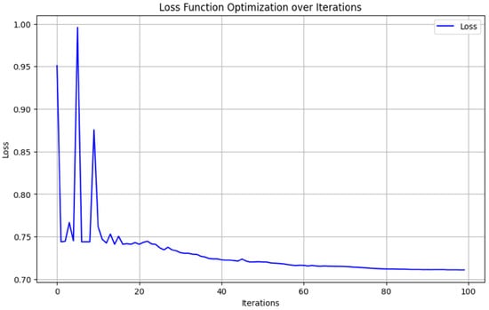 In this experiment, a value of 100 was set for the maximum number of iterations to avoid insufficient optimization due to too few iterations and the risk of overfitting or excessive execution time from overly extensive optimization. The tolerance was maintained at its default value of tol = 1 × 10−6. Below, Figure 7 illustrates an actual example of the decreasing loss values during the optimization of the VQC algorithm through 100 iterations. This indicates that, using the COBYLA optimizer, the rotation angles, which are the parameters θ of the RY gate in the RealAmplitudes ansatz, are optimized through the learning process. In a quantum setting, cross-entropy loss serves as a probabilistic framework for optimizing classification performance by minimizing the difference between predicted and actual probability distributions. By weighting the loss function to assign higher penalties to the minority class, it is possible to balance the contributions of minority and majority classes, thereby addressing class imbalance and improving overall model performance.