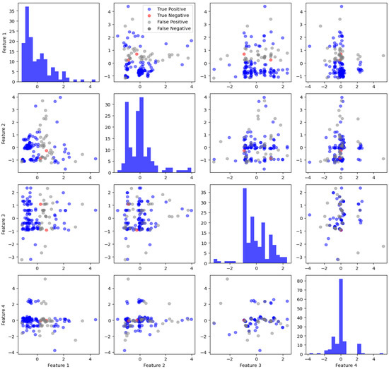 As visualized in Figure 9, the prediction results of the test dataset were represented in a 4 × 4 matrix format using four variables. Despite the apparent difficulty in determining the decision boundary for the minority class of hazardous food items (represented by red dots), the VQC algorithm, under optimized conditions, was able to interpret the characteristics of the dataset and make accurate predictions.