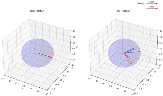 Specifically, the Pauli decomposition expresses a Hamiltonian as a linear combination of Pauli matrices (e.g., X, Y, Z), which form a basis for Hermitian matrices, and is fundamental to quantum computing tasks [53], such as enhancing classification performance during the encoding process. Additionally, the alignment of rotation axes with the data distribution plays a pivotal role in improving classification performance [54]. For instance, when data points are predominantly distributed along the x-axis, X gates are better suited as they align with the intrinsic structure of the data, whereas Y gates are more effective for data centered around the y-axis. Therefore, the ability to amplify class differences through axis rotation offers a critical design principle for VQCs, especially in tasks where separability is a key determinant of performance. Visualizations of the Bloch sphere before and after rotation during encoding procedures using the Pauli Feature Map, as shown in Figure 10, illustrate the effects of these rotations, offering a clear understanding of how various rotation strategies impact the distribution of quantum states and their separability.