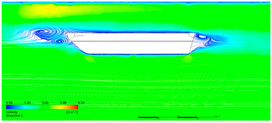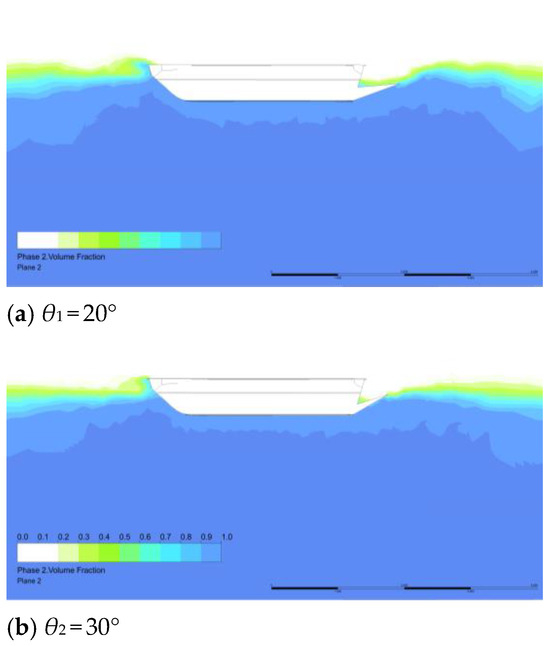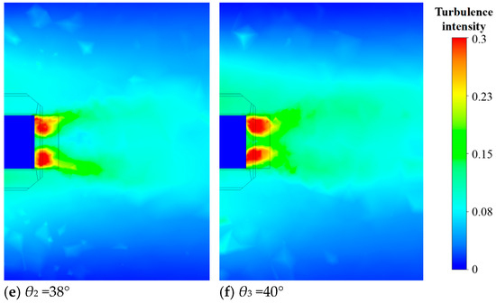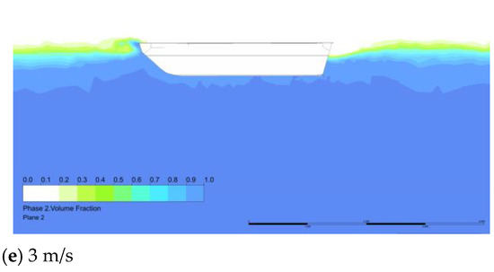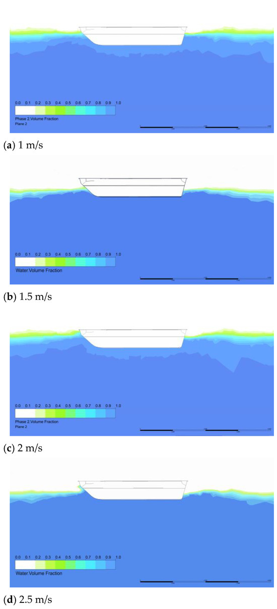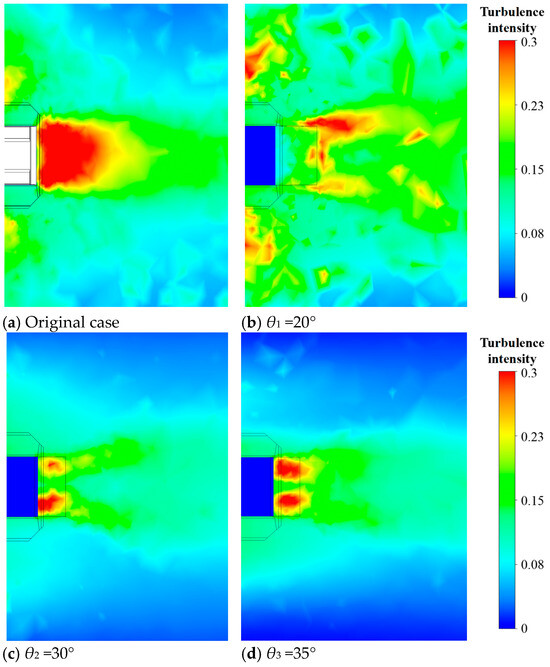 Figure 15 shows the turbulence intensity at the same horizontal cross-section under different conditions, with a distance of 0.2 m up from the bottom. It can be seen that under the original condition without a stern flap, there is a large area of high turbulence intensity at the stern, essentially covering the entire width of the stern. The source of this high turbulence is the abrupt change in the shape of the stern results in the flow separation and a wake stagnation zone. Inward fluid flow generates on both sides of the amphibious vehicle and upward deflected flow generates under the amphibious vehicle. The convergence of these flow parts and their interaction with the stagnation zone lead to intense turbulent motion, large-scale vortices and significant energy loss.