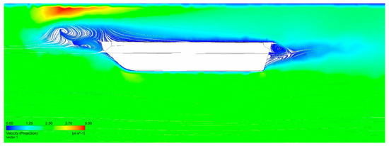 Figure 15, the main function of the stern flap is to reduce the upward flow from the vehicle bottom, rather than the inward flow of both sides of the vehicle body. Therefore, it can be inferred that for amphibious vehicles of different sizes, more suitable stern flaps can be selected based on the actual draft or stern size to ensure the guidance of sufficient length of wake and the alleviation of areas with high-intensity turbulence.