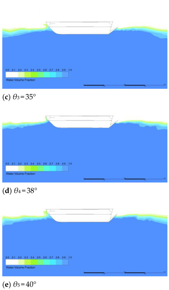 Overall, after adding a stern flap, the turbulence intensity at the stern of the amphibious vehicle is reduced, and energy dissipation is decreased due to the good flow guidance of the stern flap, thereby reducing the navigational resistance of the amphibious vehicle. The optimal angle in this simulation is 38°. Under this condition, the high-turbulence region is mainly concentrated in both sides of the vehicle bottom and then rapidly decays. It can be inferred that the vortex scale caused by flow separation with the stern flap is smaller, and the interference on the wake is decreased.