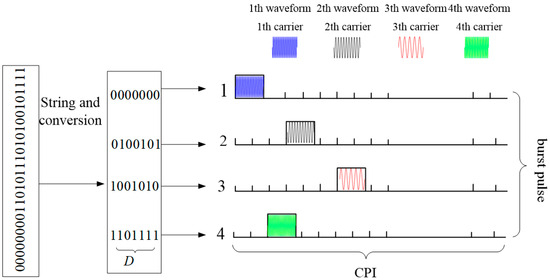 The different orthogonal waveforms, pulse repetition intervals (PRIs) of the transmitted pulses, and carrier frequencies of the transmitted pulses are used as unique code element information. By indexing these parameters, the modulation of the communication message can be achieved. If a frame of data is to be transmitted within a coherent processing interval (CPI), this frame can be converted into multiple parallel lines of data with a fixed number of bits per line.