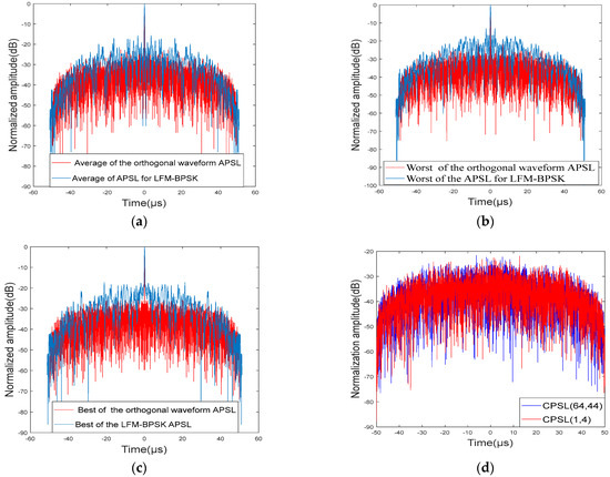 Waveform comparison. (a) Comparison of orthogonal waveform with the average APSL value of LFM-BPSK; (b) comparison of the worst value of APSL for orthogonal waveform and LFM-BPSK; (c) comparison of orthogonal waveform with the average APSL value of LFM-BPSK; (d) CPSL with orthogonal waveform.