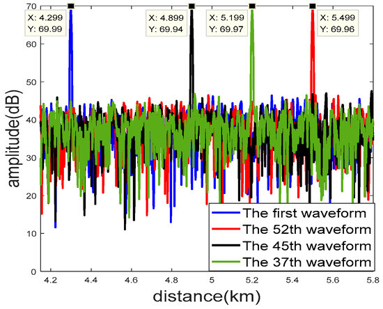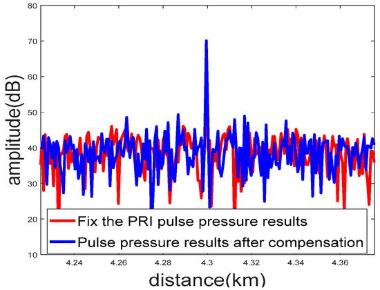 To verify that the introduction of PRI shortcuts in this chapter did not affect radar detection, conventional methods of embedding communication information in radar waveforms lose radar detection performance. The PRI shortcut times of the 1st, 37th, 45th, and 52nd waveforms are selected, and the PRI shortcut times are , , , and , respectively. Figure 7 shows the comparison of the pulse compression results of the PRI shortcut for the echo delay compensation and PRI unchanged at the distance, Figure 8 shows the comparison of the pulse compression results of the PRI unchanged and shortcut compensation, and the simulation test shows that the PRI shortcut has almost no effect on the pulse compression results after the compensation of the echo delay, which indicates that the PRI shortcut has no effect on the radar detection.