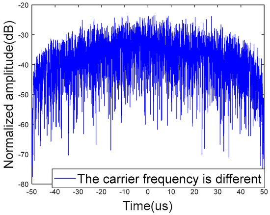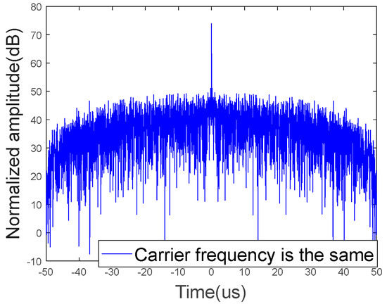 To verify that the carrier frequency shortcut has no effect on the performance of the waveform set, it is assumed that waveform 3 in the orthogonal waveform set is selected, in which the carrier frequencies of the waveform are 1 GHz and 1.58 GHz. Figure 11 shows the autocorrelation results for the waveform with a carrier frequency of 1 GHz, and Figure 12 shows the mutual correlation results for the waveform with a carrier frequency of 1 GHz and a carrier frequency of 1.58 GHz. The simulation results in Figure 11 and Figure 12 show that it does not affect the performance of the orthogonal waveform set of the waveform.