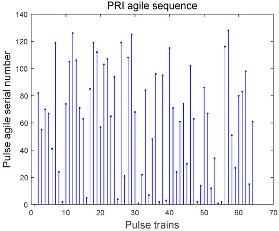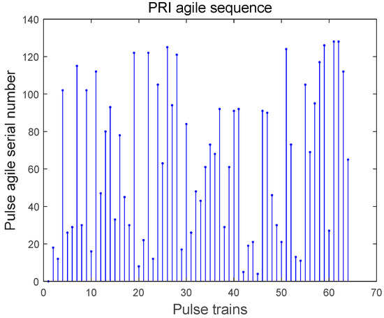 The detection performance of the three-dimensional indexed modulated probe-through integration waveform for multiple targets with distance and velocity information is verified. Under a signal-to-noise ratio of 10 dB, the number of PRI shortcuts is 128 and the PRI shortcut interval is . The PRI shortcut sequence is shown in Figure 16; the number of carrier frequency shortcuts is 64 and the carrier frequency shortcut interval is 20 MHz. The carrier frequency shortcut sequence is shown in Figure 17. The number of waveforms selected from the waveform set is 64. The perception matrix in the OMP algorithm is constructed with the coupling term of the initial distance and carrier frequency change term, the target speed and random PRI, and the random carrier frequency coupling term. Assuming that there are multiple targets in the radar scene, the number of iterations of the OMP algorithm is 3. The distance and speed information corresponding to Target 1 is 3080 m and 90 m/s; the distance and speed information corresponding to Target 2 is 3100 m and 50 m/s; and the distance and speed information corresponding to Target 3 is 3140 m and 100 m/s. Figure 18 shows that the distance and speed information of Target 1 is 3080 m and 90 m/s; the distance and speed information of Target 2 is 3100 m and 50 m/s; and the distance and speed information of Target 3 is 3140 m and 100 m/s. The results show that the probing integrated waveform with multidimensional index modulation is able to detect the information of multiple targets. For radar systems, bandwidth directly affects detection resolution and the operating range of the system. Modern radar systems typically employ wider bandwidths (e.g., GHz levels), which help to provide higher resolution and better target identification. However, a relatively narrow bandwidth of 20 MHz is chosen in this paper, the reason being that in some cases, hardware limitations or spectrum licences may make the use of a narrower bandwidth the only viable option. In addition, some radar applications such as short-range detection may not require very high resolution, and narrow bandwidths can be effective in reducing system complexity. In addition, in practical radar systems, it is ensured that the 64 waveforms are highly orthogonal to each other and maintain low levels of autocorrelation and cross-correlation; therefore, to ensure high orthogonality between waveforms, the signals can be assigned to different frequency subcarriers by assigning the signals to different frequency subcarriers. Orthogonal Frequency Division Multiplexing ensures that a plurality of waveforms are orthogonal to each other in the frequency domain, and this method generates waveforms that do not interfere with each other in either the time or frequency domains. In order to reduce the autocorrelation of the waveforms, the frequency of the signals can be changed. FM waveforms such as linear FM or spread spectrum FM have low autocorrelation and can reduce the interference of temporally repetitive signals.