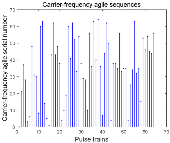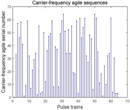 The detection performance of the three-dimensional index-modulated probe-through integration waveform for single-target distance and velocity information is verified. Under a signal-to-noise ratio of 10 dB, the number of PRI shortcuts is 128 and the PRI shortcut interval is . The PRI shortcut sequence is shown in Figure 13; the number of carrier frequency shortcuts is 64 and the carrier frequency shortcut interval is 20 MHz. The carrier frequency shortcut sequence is shown in Figure 14. The number of waveforms selected from the waveform set is 64. The perception matrix in the OMP algorithm is constructed with the coupling terms of the initial distance and carrier frequency change term, the target velocity and random PRI, and random carrier frequency coupling terms. Assuming that there is a single target in the radar scene, the number of iterations of the OMP algorithm is 1. The distance of the target is assumed to be 3080 , and the speed is 100 m/s. The simulation results are shown in Figure 15, where the horizontal coordinates denote the distance and the vertical coordinates denote the speed. Figure 15 shows that the distance of the target is 3080 , and the speed is 100 m/s. The results show that the probe-through-integrated waveform with multidimensional index modulation is able to detect information about a single target.