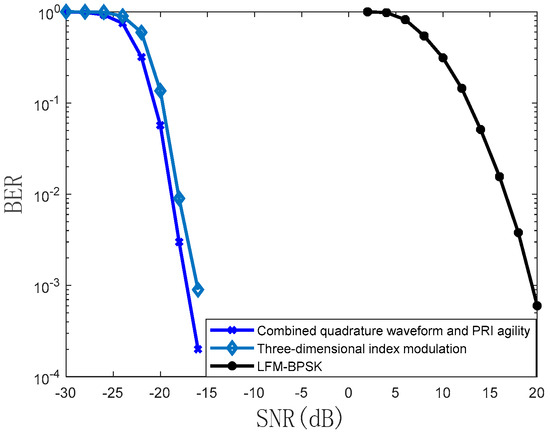 The communication performance of the three-dimensional indexed modulated probe–pass integrated waveform is verified. The false symbol rate of the three-dimensional index-modulated tan–pass integrated waveform is calculated via 10,000 Monte Carlo simulations under the conditions of signal-to-noise ratios (SNRs) of −30 dB to −16 dB. The variation curve of the false symbol rate with the SNR is shown in Figure 19 shows that, compared with the false symbol rate of the conventional LFM-BPSK, the design of the probe-through integrated waveform with multidimensional index modulation in this paper is able to achieve a lower false symbol rate with a low signal-to-noise ratio. However, it is worth noting that achieving a signal-to-noise ratio of −30 dB to −16 dB is indeed a considerable challenge for most radar systems, especially in the absence of efficient noise reduction techniques. Therefore, in order to remain robust under such conditions, the signal strength can be increased in the design by gain control and power amplifier optimisation to cope with the low SNR environment, while the use of advanced signal processing techniques, such as adaptive filtering, waveform design, and multiple-input multiple-output MIMO techniques, can help to enhance the detection performance at lower SNR.