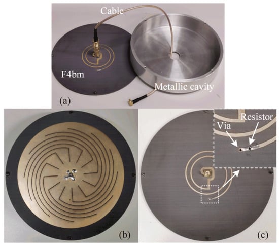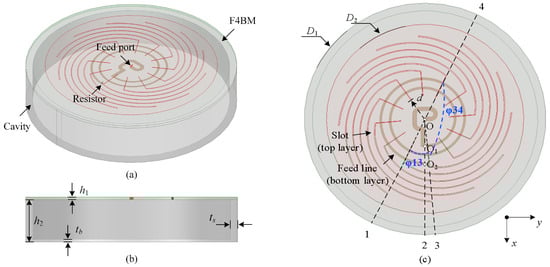Figure 1 shows the schematic diagram of the antenna. The antenna uses an F4B microstrip dielectric substrate, whose relative permittivity is 2.65. The radiation patch adopts the symmetrical structure of spiral microstrip slots, and finally, the radiation antenna substrate is fixed on the metal cavity. Each spiral slot consists of a radial arm and an Archimedean arm. The length of the radial arm is 13 mm, and the width is 0.5 mm. The entire Archimedean arm forms an angle from its initial end to its terminal end, and the angle is 150°. The thickness of the dielectric substrate is 1.5 mm, and the microstrip radiation surface is circular. The diameter of the circular radiating patch is 102 mm; the diameter of the entire antenna is 122 mm; the height of the metal cavity is 25 mm; the thickness at the bottom of the metal cavity is 2 mm; the thickness at the upper edge of the metal cavity is 4 mm; and the center of the radiating patch, which is also the feeding point of the coaxial connector O, has a distance d of 12 mm from the port of the radial arm. is the port of the inner-loop feeder in the feeder line, and is the port of the outer-loop feeder in the feeder line. Moreover, O, , and are on the same straight line, which is denoted as line 2. The angle between line 2 and the radial arms in the figure is , and . The line segment formed by the end of the Archimedean arm and point O is denoted as line 4, and its angle with line 2 is 155°. The angle between two adjacent radial arms is 30°. The microstrip feed line can be divided into the following two parts: the excitation part and (with a curvature of b = 0.5 mm/rad and a width is 1.1 mm) and the quarter-wavelength matching part (with a width of 2 mm). The 50 ohm coaxial connector and the 150 ohm absorbing resistor are, respectively, located at positions O and . The derivation of parameter optimization will be further explained in the following section.