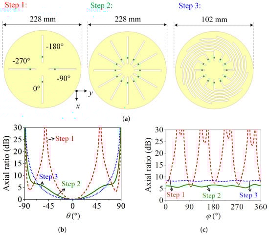 As shown in Figure 2, we have conducted an in-depth investigation and meticulous comparison of three different slot structures, aiming to elucidate the corresponding working principles. Firstly, the specific configuration of the antenna is presented in Figure 2a, where the length of the slots is carefully set to half the wavelength of the center frequency (1.4 GHz). On this basis, the sequential rotation feeding technique is employed, and the application of this technique enables the successful realization of excellent right-hand circular polarization (RHCP) radiation performance in the boresight direction. During the simulation process, N slots are excited, and the amplitudes of the excitation signals remain equal. It is worth noting that the feeding phase shift between two adjacent slots is set to . Under this specific condition, the size of the axial ratio depends only on the amplitude difference between the two electric field components. For Step 1, the specific conditions are shown in Figure 2a, where two pairs of radial slots are arranged vertically and the feeding signal phases of the four slots are , , , and , respectively. Correspondingly, as can be observed from Figure 2b, the antenna exhibits the optimal axial ratio frequency response (AR = 0 dB) on the z-axis at this time. However, as shown in Figure 2c, the axial ratio exhibits a sharp change at certain azimuth angles on the elevation plane, accompanied by significant ripples. For example, when , it can be clearly observed that the radiation wave has degraded to linear polarization at this time. Through in-depth analysis, we believe that this is mainly due to the relatively large sequential angular spacing of the radiators, which further leads to the poor rotational symmetry of the antenna’s fields and currents, thus affecting the axial ratio performance. In order to effectively reduce the dependence of the antenna’s axial ratio response on the azimuth angle in Step 1, we have implemented an improvement measure, that is, we increased the number of slots to 12 and ensured their uniform distribution. After this adjustment, the change in axial ratio circularity is significantly reduced and can reach 2 dB, as shown in Step 2 of Figure 2a. Finally, on the basis of Step 2, further enhancements and optimizations are carried out on the structure. In Step 3, we design the slots following a unique combination of “radial arm + Archimedean arm”, and these slots are evenly distributed and closely surrounded. Through this innovative design, the antenna has achieved performance improvements in various aspects. It not only reduces the area by 55% but also further improves the axial ratio circularity, reaching a more ideal level of 1 dB.