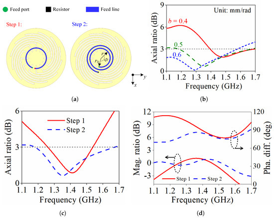 The feeder line consists of an inner loop feeder and an outer loop feeder. Its design objective is to optimize the circular polarization radiation performance of the high-frequency band and the low-frequency band, respectively. As can be clearly observed from Figure 3c,d, two response ripples with an amplitude ratio close to 0 dB and a phase difference close to 90°, significantly broaden the frequency range. From Figure 3b, it can be concluded that the utilization of two turns of the feed lines facilitates the realization of a relatively lower axial ratio. In Figure 3b, the simulation results of the two turn feeders with different growth rates are also presented. When the growth rate increases from 0.4 mm/rad to 0.6 mm/rad, the corresponding axial ratio response exhibits a distinct shift towards the low-frequency band. After comprehensive performance evaluation and analysis, it is finally determined that the target antenna adopts the parameter value of b = 0.5. This enables the achievement of the widest low axial ratio bandwidth.