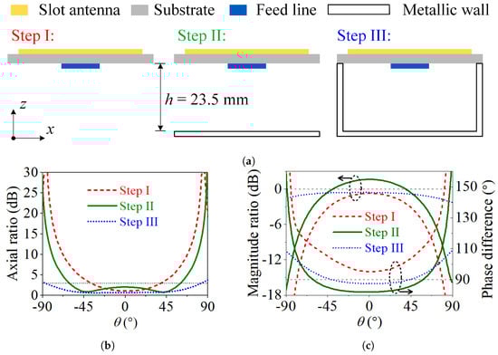 Furthermore, this paper conducts research on how to expand the low-axial ratio beam. In Step 1 of Figure 4, due to the lack of a reflector, the antenna has a relatively large back lobe, which leads to energy diffusion. For TAT imaging, the antenna only needs to radiate directly upward. The radiation of the back lobe not only reduces the efficiency of microwave transmission but may also cause signal interference with other devices. In view of the above problems, a metal reflecting surface is added to the back of the antenna in this paper. As a result, the radiation pattern of the antenna is transformed into a unidirectional broad side radiation pattern. This unidirectional broad side radiation pattern can concentrate the microwaves and radiate them in a specific direction, improving the microwave transmission efficiency. At the same time, this structure helps to expand the ARBW. To further expand the ARBW, an improved metal back cavity structure was proposed and designed. Strong currents are generated through the outer wall of the cavity. These strong currents affect the and radiations at low elevation angles in different ways. As can be clearly observed from Figure 4c, the amplitude ratio and phase difference between the two electric field components have changed significantly and become much less dependent on the angle. In actual measurements, their amplitude ratio and phase difference values are approximately 0 dB and 90°, respectively. This change makes the radiation characteristics of the antenna more stable and uniform at different angles. As shown in Figure 4b, through this series of optimized designs, the ARBW reaches 170°.