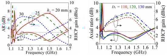 To further investigate the influence of the metal back cavity based on the target antenna design in Figure 1, the following figure shows the simulated axial ratio and the circular polarization gain on the right side under different cavity parameters. In the left subfigure of Figure 5, the red line in the upper right part represents the right-hand circular polarization (RHCP) gain when the cavity height is 20 mm, while the green and blue dashed lines, respectively, represent the RHCP gains at cavity heights of 25 mm and 30 mm. In the lower left part of the same subfigure, the red solid line, the green dashed line, and the blue dashed line represent the axial ratios at cavity heights of 20 mm, 25 mm, and 30 mm respectively. It can be seen in Figure 5 that when the cavity height increases from 20 mm to 30 mm, both the axial ratio and the polarization gain shift to the lower frequency bands. In the right subfigure of Figure 5, the red solid line and dashed line represent the simulated axial ratio and right hand circular polarization (RHCP) gain respectively when the cavity diameter is 110 mm. The green and blue solid lines and dashed lines represent the simulated axial ratios and RHCP gains, respectively, when the cavity diameters are 120 mm and 130 mm. It can be included that when the cavity diameter changes from 110 mm to 130 mm, the right hand circular polarization gain becomes higher. Therefore, considering the circular polarization performance and gain comprehensively, the values are selected as 25 mm and 120 mm, respectively.