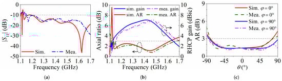 Comparison of simulation and test results. (a) |S11|. (b) Axial ratio bandwidth and gain bandwidth. (c) Axial ratio of the cross-section at 1.4 GHz.