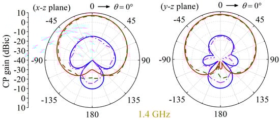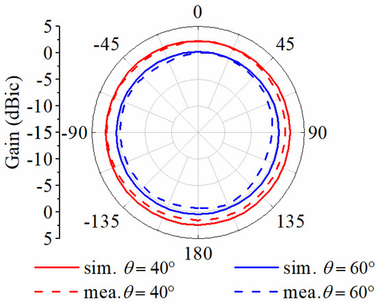 Figure 6 shows the physical image of the antenna, and the edge of the dielectric substrate is assembled and fixed with screws. One end of the coaxial cable with SMA connectors at both ends is connected to the central feed point of the antenna, and the other end is connected to the outside. As shown in Figure 7a, the measured reflection coefficient curve is in good agreement with the simulation results, and the |S11| is lower than −10 dB within the range of 1.15–1.7 GHz. In Figure 7b,c, the measured and simulated axial ratios as well as the circular polarization gain of the antenna match well. The beamwidth in the axial ratio at = 0° is 144°. In the left subfigure of Figure 8, the red solid line and the green dashed line represent the principal circular polarization patterns in the E plane respectively. The blue solid line and the purple dashed line represent the cross—circular polarization patterns in the E plane respectively. In the right subfigure of Figure 8, the red solid line and the green dashed line represent the principal circular polarization patterns in the H plane respectively. The blue solid line and the purple dashed line represent the cross circular polarization patterns in the H plane respectively. Figure 8 illustrates that the measured radiation patterns agree well with the simulated radiation patterns, showing good CP performance. Figure 9 presents a comparison of the radiation patterns at angles = 40° and = 60°. The results demonstrate that the pattern roundness in simulations agree well with the measurements, with the gain levels at lower elevation angles remaining within an acceptable range. This ensures that the antenna can stably emit electromagnetic waves with equal power in all directions, allowing the biological tissue above the antenna to uniformly receive the electromagnetic energy emitted by the antenna.