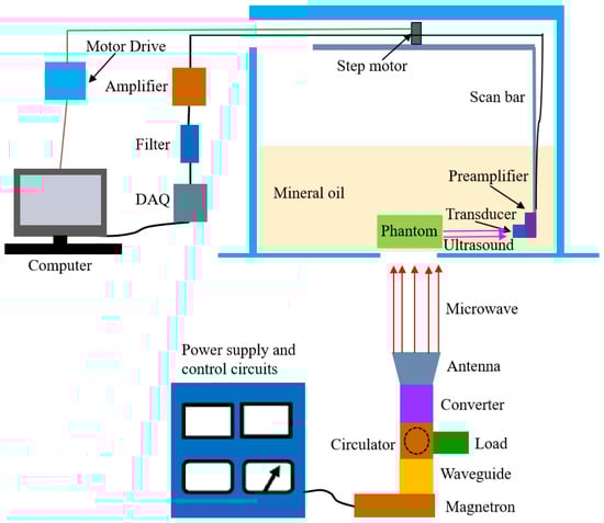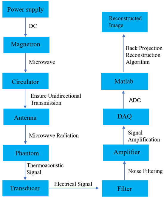 The experimental setup is shown in Figure 10 and the flowchart of the signal processing is shown in Figure 11. First, a direct current is provided to the magnetron through a power supply. The high-voltage direct current acts on the magnetron, and the power supply is applied between the cathode and the anode, forming a strong electric field. Meanwhile, the magnetron is placed in a magnetic field environment perpendicular to the electric field. Under the influence of these orthogonal electric and magnetic fields, the electrons emitted from the cathode follow cyclotron motion, which excites the electromagnetic field in the anode resonant cavity, triggering high-frequency oscillations and forming standing waves at microwave frequencies. The microwave frequency generated by the magnetron is . The narrower the pulse width of the microwave, the higher the resolution of the final image. However, an overly narrow pulse width results in insufficient microwave energy radiated onto the phantom which, in turn, affects the quality of the reconstructed image. After comprehensive consideration, we ultimately chose a microwave pulse width of and a pulse repetition frequency of . The microwaves pass through the waveguide and the circulator, finally propagating the antenna. The circulator enables microwave transmission in one direction, and the microwaves reflected back due to mismatching or other reasons are absorbed by the load instead of re-entering the magnetron and causing damage to it. The microwaves radiate energy through the antenna and finally act on the phantom. Agar powder, as a substance with excellent gel properties, can form a medium with certain hardness and elasticity when combined with water, approximating to the texture and structure of breast tissue to a certain extent. Finally, the physical and physiological characteristics of the breast are simulated by mixing agar powder with water. Mineral oil is often used as an ultrasonic coupling medium due to its excellent acoustic matching properties. It is also a good electrical insulator, which can reduce electromagnetic interference. In addition, mineral oil absorbs very little microwave energy, ensuring that the heat is concentrated in the target tissue rather than in the medium itself. The phantom is placed in a container and is positioned right above the antenna.