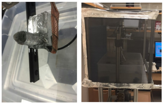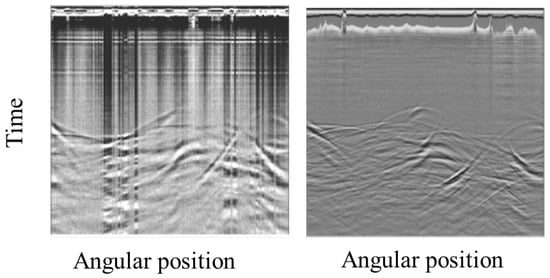 The entire phantom needs to be immersed in mineral oil. An ultrasonic transducer of model V323, which belongs to Panametrics—119 NDT—with a central frequency of 2.25 MHz and a diameter of 6 mm, is placed on a rotational scanning device. As shown in Figure 12, the transducer is wrapped with a metal mesh, and the entire ultrasonic absorption system is wrapped in a Faraday cage. As shown in Figure 13, the left figure shows the TAT signal diagram received without adding the Faraday cage and a metal mesh, and the right figure shows the TAT signal diagram received with the addition of the Faraday cage and a metal mesh. It can be deduced that after adding shielding measures, the signal interference of the microwaves is drastically reduced, which improves the quality of the reconstructed image.