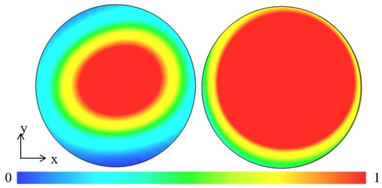 For a better analysis of the antenna’s field distribution during the simulation process, we constructed an air layer with a relative dielectric constant of 1 and a relative magnetic permeability of 1, which is located 4 cm above the antenna. The diameter of this air layer is 8 cm and is used to simulate the normal size of a breast. The left side of Figure 14 shows the electric field distribution of the traditional helical antenna, and the right side of Figure 14 shows the electric field distribution of the novel slot spiral symmetric array antenna. In order to better compare the uniformity of the field distribution, the electric field strength has been normalized. It can be found that the antenna proposed in this paper can generate a more uniform electric field distribution.