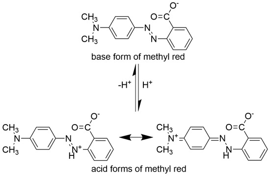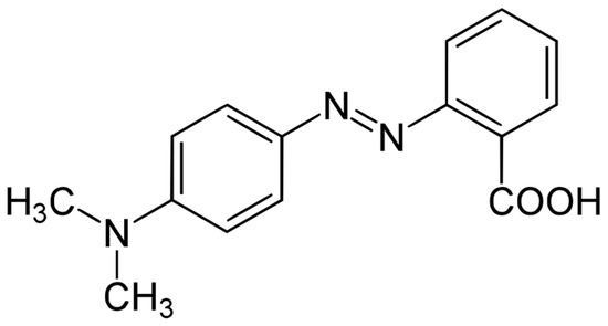 Here, we report on the solvatochromic investigation of ternary solutions in which the binary solvent was obtained by mixing Triton X-100 with water, methanol, ethanol, and 1-propanol, respectively. Methyl red dye (schematic of the molecule shown in Figure 2) was used as a solvatochromic probe, its absorption spectral bands being recorded in solutions prepared with different mole ratios between Triton X-100 and water/alcohols. The Kamlet–Abboud–Taft model [82] was employed to estimate the contribution of each type of intermolecular interaction to the total spectral shift of the electronic absorption band of the solute. The composition of the cybotactic region of the solute’s molecule was comparatively estimated by using the three above-mentioned models. The statistical cell model of ternary solutions allowed the calculation of the difference between the interaction energies of two molecules in pairs of the type of solute–solvent. The Bosch–Rosés model provided important information on the 1:1 complex formed between Triton X-100 and the other solvent molecules. It also allowed the estimation of the composition of the cybotactic region of the solute’s molecules, emphasizing the symmetry/asymmetry related to the binary mixture of solvents in this region.