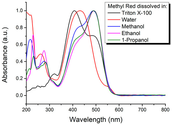 Electronic absorption spectral bands of methyl red dissolved in Triton X-100, water, methanol, ethanol, and 1-propanol, respectively.