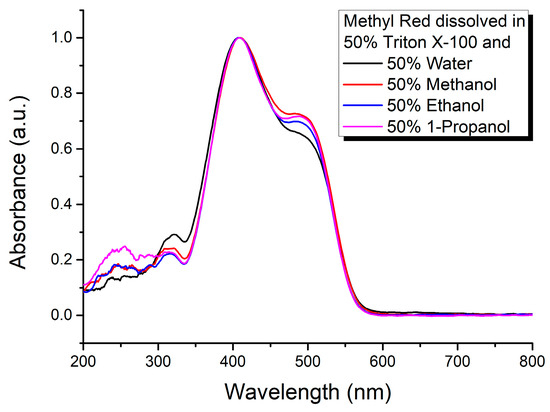 All chemical compounds were bought from Sigma Aldrich (now Merck), St. Louis, MO, USA. The double distilled water was prepared in our laboratory. The purity of the used chemical compounds is as follows: Triton X-100—for analysis; methanol—ACS reagent, ≥99.8%; ethanol—puriss. p.a. absolute, ≥99.8%; 1-propanol—ACS reagent, ≥99.5%; methyl red—pH indicator, ACS reagent Ph. Eur. The ternary solutions of methyl red were prepared with a concentration of 10−4 mol/L. The methyl red powder was weighed with a Mettler balance XSR105 (Mettler Toledo, Columbus, OH, USA). The binary solvents were prepared by measuring the volumes of the liquid solvents with micropipettes.