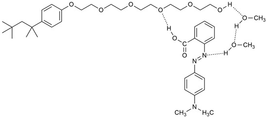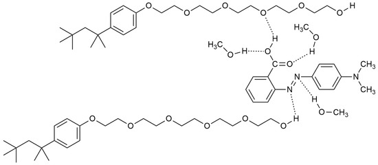 Two spectral bands can be distinguished in the visible range of the spectra from Figure 3 and Figure 4, one with a maximum corresponding to around 410 nm and another one with a maximum corresponding to around 490 nm. These bands correspond to the acid–base resonance forms of methyl red, schematically shown in Figure 5 (see also [89,90,91]). The first band corresponds to the base form of methyl red [92], and it is predominantly in the presence of Triton X-100 and water, respectively (see Figure 3), while the second band corresponds to its acid form, being predominantly in the presence of alcohols (Figure 3). In the case of the mixtures, the presence of Triton X-100 determines a decrease in the second band amplitude, with the first spectral band remaining predominant (Figure 4). This happens because the Triton X-100 molecule has a rather high HBA (hydrogen bonding acceptor) count of 6, being able to make hydrogen bonds with the protons of the alcohols’ hydroxylic group. Methyl red has an HBA count of 4 and an HBD (hydrogen bonding donor) count of 1, also being involved in hydrogen bonding with the molecules of solvents, as schematically shown in Figure 6. However, neither Triton X-100 molecules nor water/alcohol molecules can exclusively solvate methyl red. Consequently, concerted interactions among all molecules must be considered, as described in [93]. An example of such possible concerted interactions is shown in Figure 7.