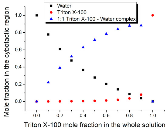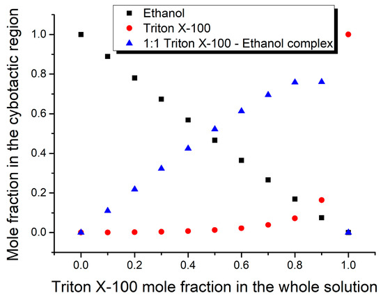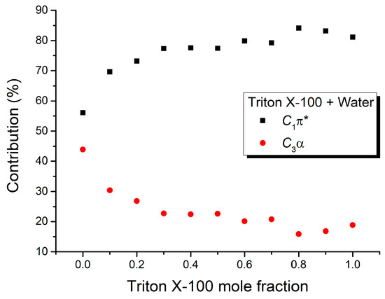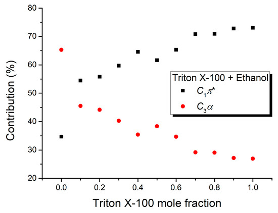 The first solvatochromic studies of Triton X-100’s binary mixtures with different solvents were reported by Kohantorabi et al. [80,81], who experimentally estimated the values of Kamlet–Abboud–Taft [82] solvatochromic parameters π*, β, and α for several mixtures. These values were used in the present article for analyzing the spectral data.