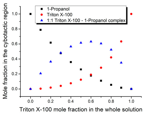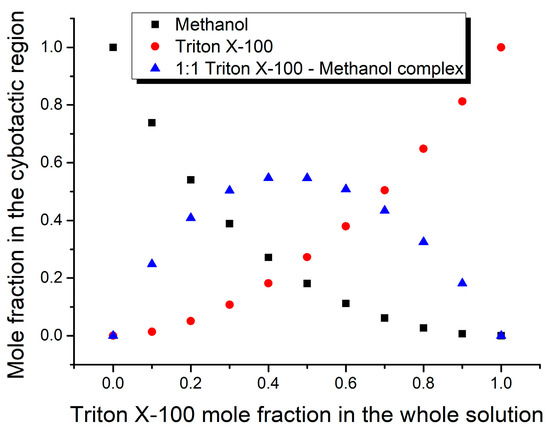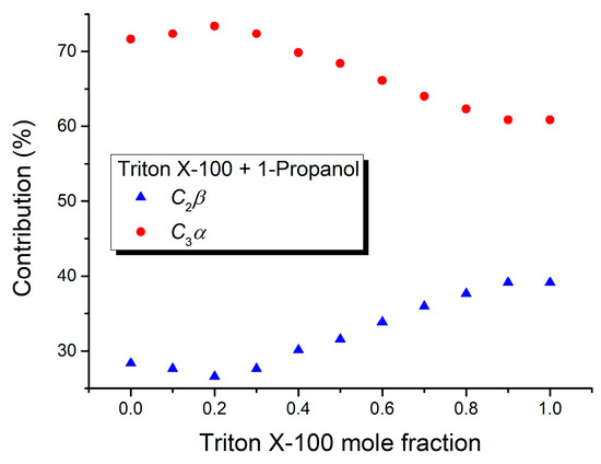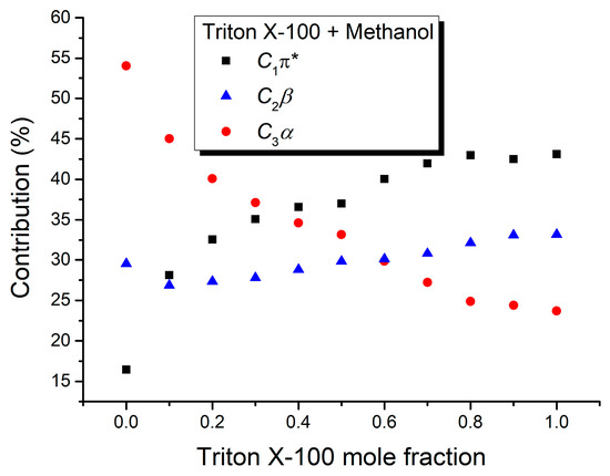 The contribution of the specific interactions of the type of hydrogen bond donor (described by the term C3α) is important, being present in all investigated binary mixtures. It is dominant in the case of binary mixtures Triton X-100 + 1-propanol and Triton X-100 + methanol up to the value 0.3 of the Triton X-100 mole fraction. The contribution of this type of interaction generally decreases with the increase in the Triton X-100 mole fraction.