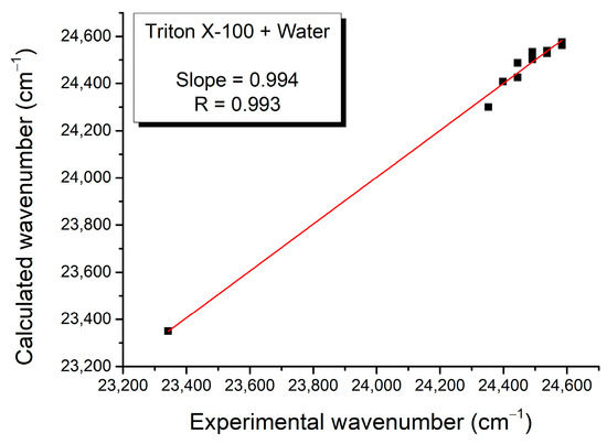 Calculated (with Equation (13)) versus experimental wavenumbers corresponding to the maximum of the electronic absorption spectral band of methyl red dissolved in Triton X-100 + water. The red line represents the linear regression of the data.