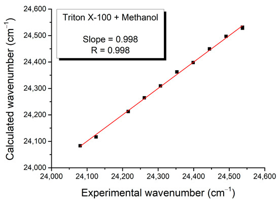 Calculated (with Equation (14)) versus experimental wavenumbers corresponding to the maximum of the electronic absorption spectral band of methyl red dissolved in Triton X-100 + methanol. The red line represents the linear regression of the data.
