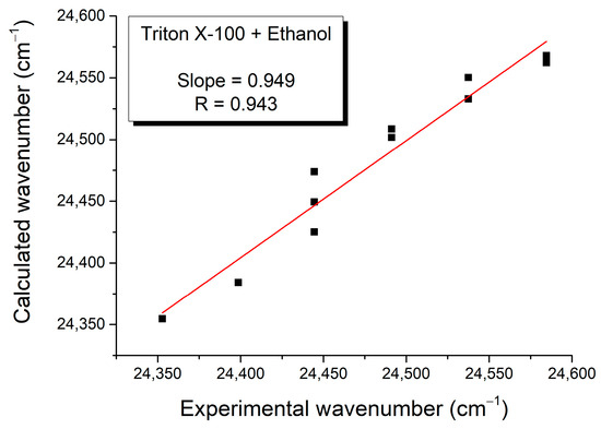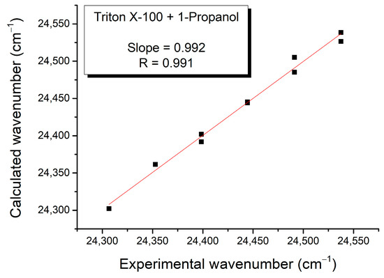 Calculated (with Equation (16)) versus experimental wavenumbers corresponding to the maximum of the electronic absorption spectral band of methyl red dissolved in Triton X-100 + 1-propanol. The red line represents the linear regression of the data.