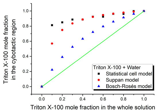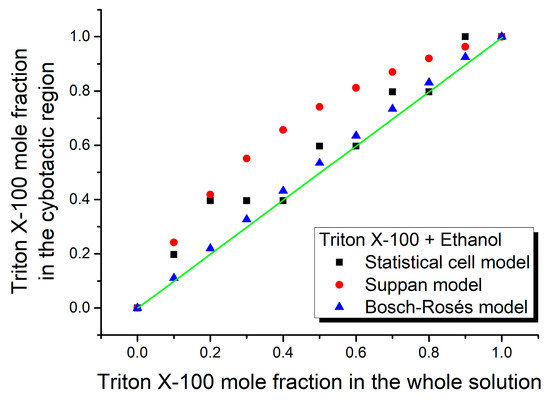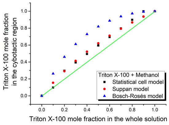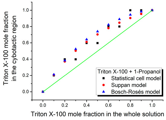 Comparative estimation of the methyl red molecule cybotactic region’s composition by statistical cell model, Suppan model, and Bosch–Rosés model for the binary mixture Triton X-100 + water. The green line represents the first bisector.
