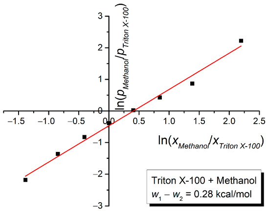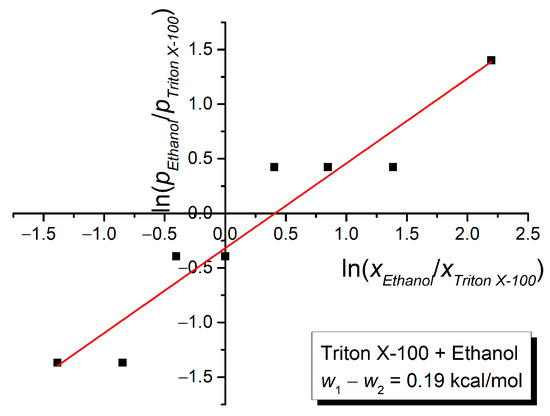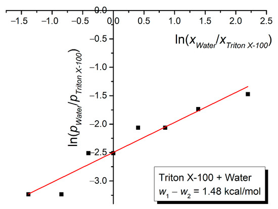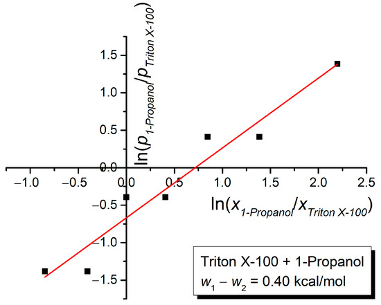 where x1 and x2 are the mole fractions of the two solvents, respectively, in the whole ternary solution; k and T are the Boltzmann constant and temperature; and w1 and w2 are the interaction energies in the pairs of molecules of the type of solute–solvent 1 and solute–solvent 2, respectively. By the linear regression of the above equation, the difference w1 − w2 can be estimated.