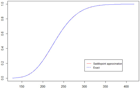 The comparison between the second column (, the exact values) and the third column (, the saddlepoint approximations) in Table 4 demonstrates that the values of and are highly similar for all tested values of s. The differences between the exact and approximate values are minimal, typically observed in the third or fourth decimal place. The saddlepoint approximation maintains accuracy across a wide range of s values, from 50 to 140. This consistency suggests the robustness of the saddlepoint method.