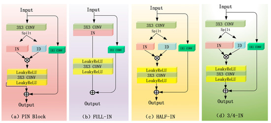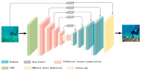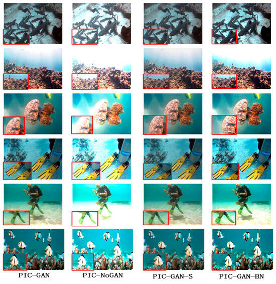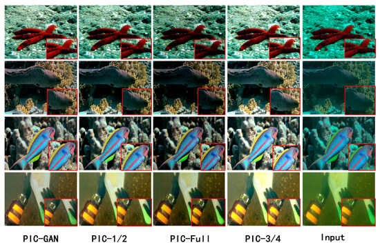 Meanwhile, in order to further validate the reasonableness and effectiveness of the partial instance normalisation (PIN) strategy, under the premise of ensuring the consistency of the experimental parameters, we carried out a detailed analysis of the influence of different normalisation division ratios on the enhancement effect of underwater images. The experimental design included four instance normalisation strategies: full instance normalisation (PIC-Full), half instance normalisation (PIC-1/2), 3/4 instance normalisation (PIC-3/4), and partial instance normalisation (PIC-GAN) proposed in this paper. The experimental results are shown in