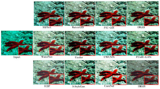 17], conducting comparative experiments. The results of the experimental data clearly show that PIC-GAN exhibits excellent performance in a number of key evaluation metrics (PSNR, SSIM, LPIPS, UCIQE, and UIQM), proving its superiority in underwater image enhancement tasks, and the results are shown in