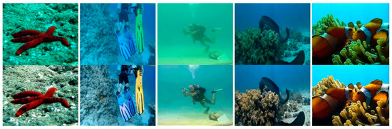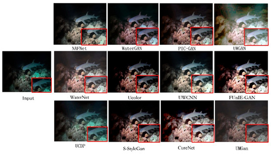 In addition, we combined three datasets and selected 200 images with extreme colour distortion and low visibility of the underwater environment for individual testing to verify the performance of PIC-GAN in extreme environments. The results are shown in