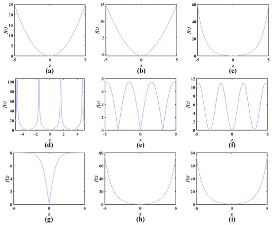 Here, System (1) contains two non-bifurcation parameters, where parameter b is the amplitude parameter [30], parameter c is the offset boosting parameter for the x-dimension, and parameter a is the bifurcation parameter. To explore the impact of complex nonlinear feedback on chaotic dynamics, we consider replacing the quadratic feedback term with other complex nonlinear functions, thus obtaining the general Equation (2) containing special nonlinear feedback terms.