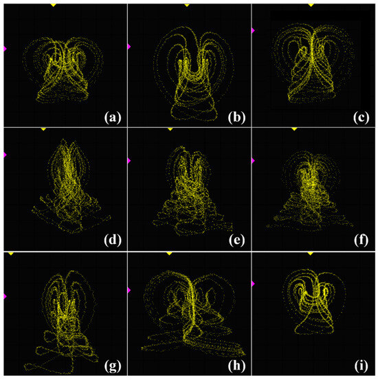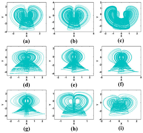Projections of strange attractors in the x–y plane corresponding to different nonlinear feedback: (a) CSCF0; (b) CSCF1; (c) CSCF2; (d) CSCF3; (e) CSCF4; (f) CSCF5; (g) CSCF6; (h) CSCF7; (i) CSCF8.