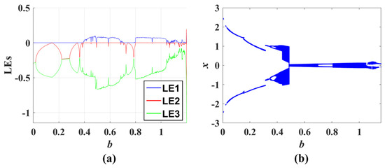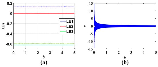 Non-bifurcation evolution under the amplitude controller b of the system CSCF1: (a) Lyapunov exponents, (b) bifurcation diagram.