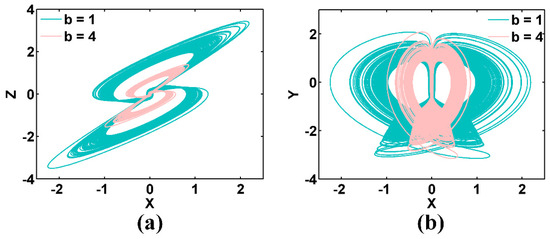 It can be seen that the changing in parameter causes the amplitude of system variables and to change. The system parameter b achieves partial amplitude control of x and z, with an amplitude control scale of . In system CSCF1, when the parameter changes within (0, 5], the corresponding Lyapunov exponent and bifurcation parameter evolution are shown in Figure 3, while the amplitude control effects produced by different parameters b can be further illustrated by the phase trajectories and waveforms under two different parameters, as shown in Figure 4 and Figure 5, respectively.