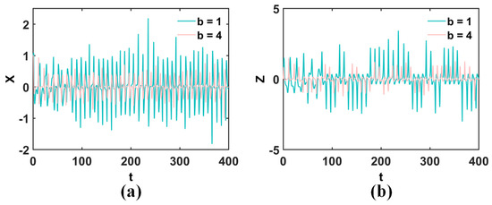 Waveforms of the system CSCF1 when parameter b is varied: (a) X(t); (b) Z(t).
