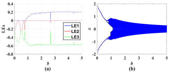Dynamical evolution in system CSCF8 under parameter b: (a) Lyapunov exponents, (b) bifurcation diagrams.