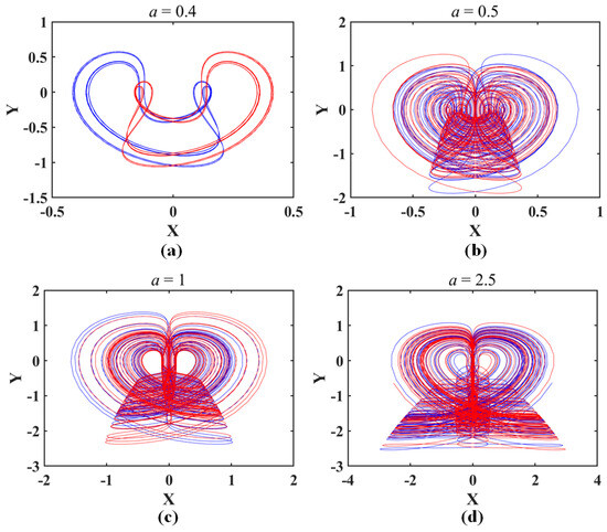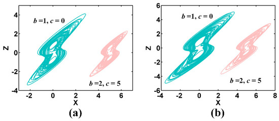 After substituting with into the system Equation (2), the parameter in the system equation will disappear, which shows that the parameter in the system equation achieves the offset boosting of the system variable . Since the nonlinear function introduced in the second dimension of the system is only related to the state variable, the nonlinear feedback function at this time will not change the boosting effect of the non-bifurcation parameter . However, since the amplitude control parameter has realized the regulation of the geometric size of the attractor, and the offset control has realized the transfer of the attractor in the phase space, the boosting process may exist independently of the amplitude control parameter. For example, in the system CSCF0, let , and the system turns to be: