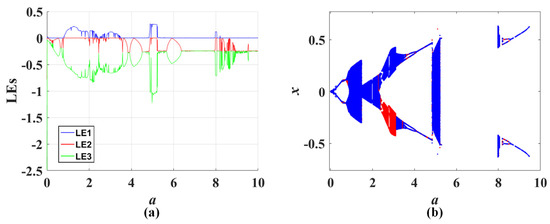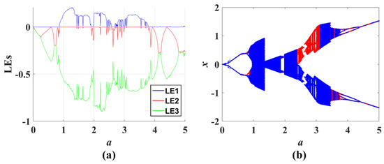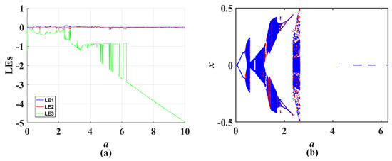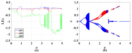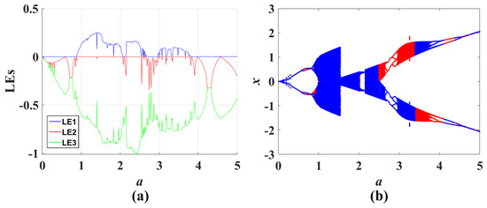 Dynamic evolution of CSCF0 when parameter a varies: (a) Lyapunov exponents, (b) bifurcation diagram. Initial conditions (IC) are: ICs = [−1, 1, −1] (blue), ICs = [1, 1, 1] (red).