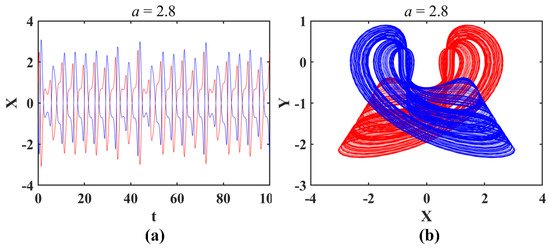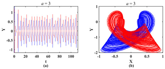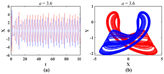 Coexisting solutions of CSCF1 as parameter a is varied: (a) X(t), (b) the phase tracks in the x–y plane. ICs = [−1, 1, −1] (blue), ICs = [1, 1, 1] (red).