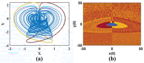 Coexisting attractors of CSCF8 with a = 1, b = 1 and their corresponding basins of attraction: (a) coexisting periodic and chaotic states. ICs = [−1, 1, −1] (blue), ICs = [1, 0, 0] (red), ICs = [−1, 0, 0] (yellow). (b) Basin of attraction in the x(0)–y(0) plane (z(0) = 0).
