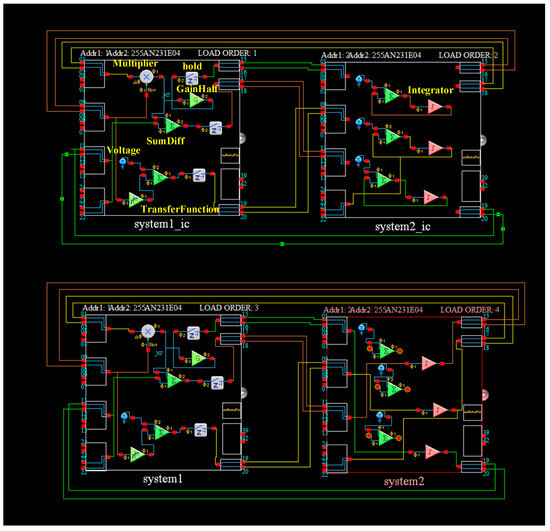 The implementation of the analog chaotic circuit requires selecting and configuring chip parameters in the design software AnadigDesigner 2, as well as setting the weights of different CAM devices. Since the basic equation structures of systems CSCF0—CSCF8 are the same, with the difference being only in the parameters , and the complex nonlinear function , it is only necessary to modify some CAM devices and their weights to implement systems CSCF0-CSCF8. Considering that the initial values of each system are not zero, it is necessary to use the dynamic routing configuration function of FPAA [32]. Figure 20 is the block diagram of the FPAA system. For ease of analyzing logical relationships and distinguishing variables, green lines represent variable , yellow lines represent variable , and brown lines represent variable . Combining the principle of dynamic configuration routing of PFAA, the entire system block diagram can be divided into two modules—the integrator charging module (system1_ic and system2_ic) and the chaotic circuit implementation module (system1 and system2). The integrator charging module mainly sets the initial values of the chaotic system, while the chaotic circuit implementation module operates on the set initial values of the chaotic system and outputs chaotic waveforms. The wiring connection between the two chips (system1_ic and system2_ic) in the integrator charging module is consistent with the wiring connection between the two chips (system1 and system2) in the chaotic circuit implementation module. In addition, the I/O configuration methods in both modules are also consistent. The difference between the two modules is that in the integrator charging module, the integrator in system2_ic is not connected to the variable output by system1_ic, but is connected to its internal negative feedback adder, while in the chaotic circuit implementation module, the integrator in system2 is connected to the variable output by system1. The system2_ic in the integrator charging module implements integrator charging, thereby completing the setting of the initial values of the chaotic system. By controlling the value of the constant , the integrator is charged to the desired initial value . In AnadigDesigner 2, only the Voltage (±2 V) CAM device can realize a fixed constant, which cannot change parameter . It is necessary to control the multiplier coefficient of the corresponding adder to achieve the setting of , and it is necessary to satisfy the multiplier coefficient = .